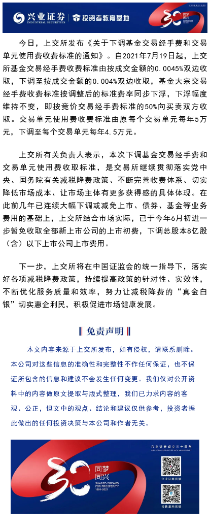 【兴·分享】上交所下调基金交易经手费和交易单元使用费收费标准