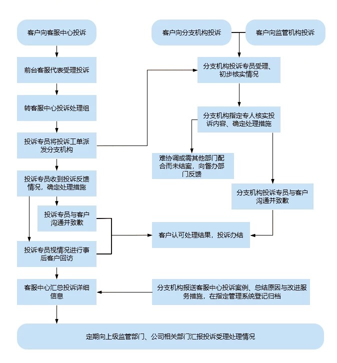 尊敬的投资者:非常感谢您对我公司的关心和支持!如果您对我们的服务有建议或意见,欢迎您及时告知,我们将在第一时间回复。为提升我司客户服务水平,现将我司全国统一的投诉受理渠道及处理流程进行公示。